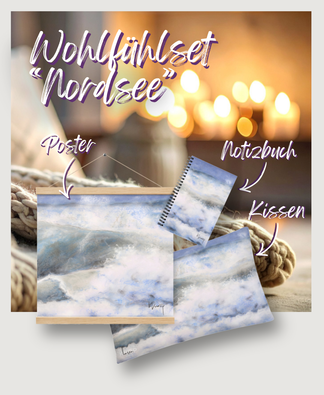 Diese maritimen Wohlfühlsets bringen dir kuscheliges Küstenfeeling nach Hause. Jedes Set besteht aus einem Poster, Notizbuch und Kissen mit Original-Motiv von Karen Knop Artwork. Wähle zwischen fünf Nordsee-Motiven - perfekt auch als stilvolle Geschenk-Idee!