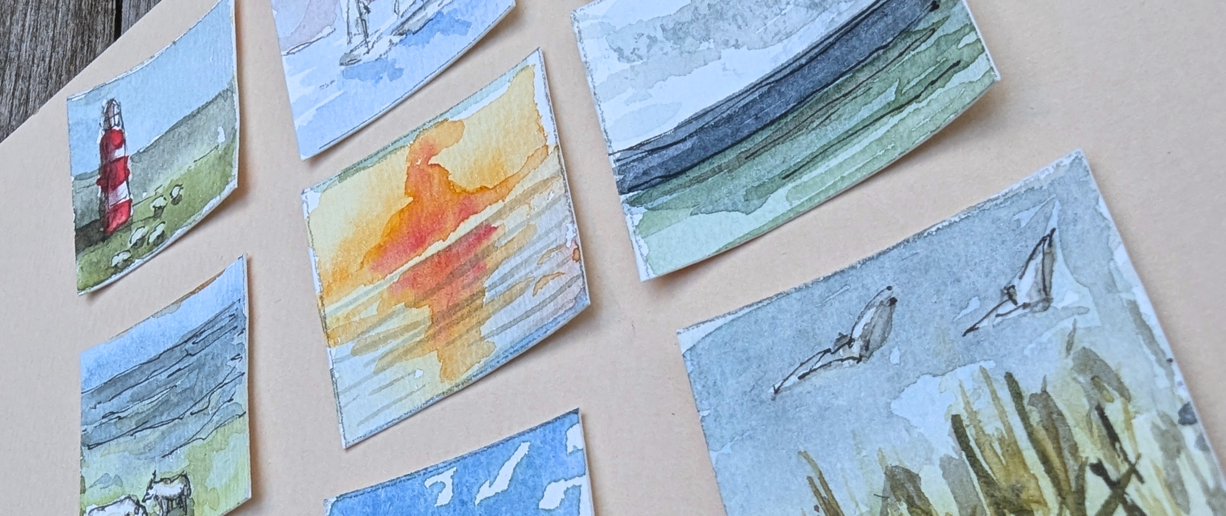 Lass dich von meiner ersten KUNST-BRISE erfrischen! In diesem Video zeige ich dir, wie neun kleine Bildminiaturen mit typischen Nordseemotiven (Leuchtturm, Schafe, Watt) entstehen. Dein Mitmach-Impuls für spontane Kreativität!