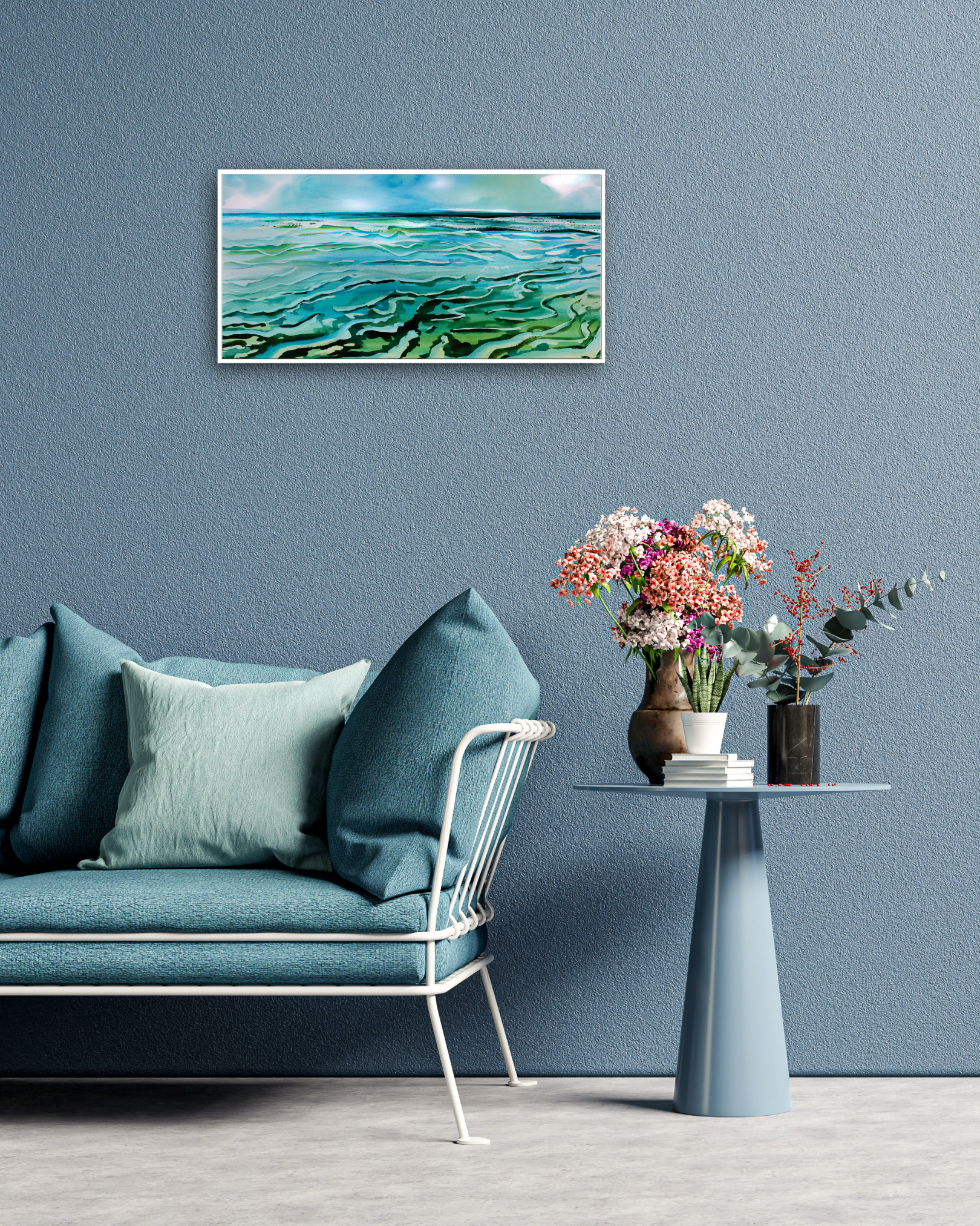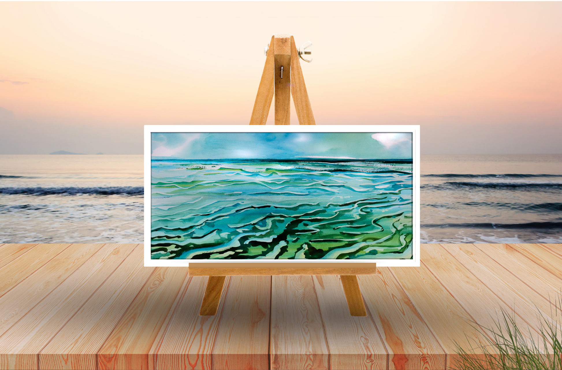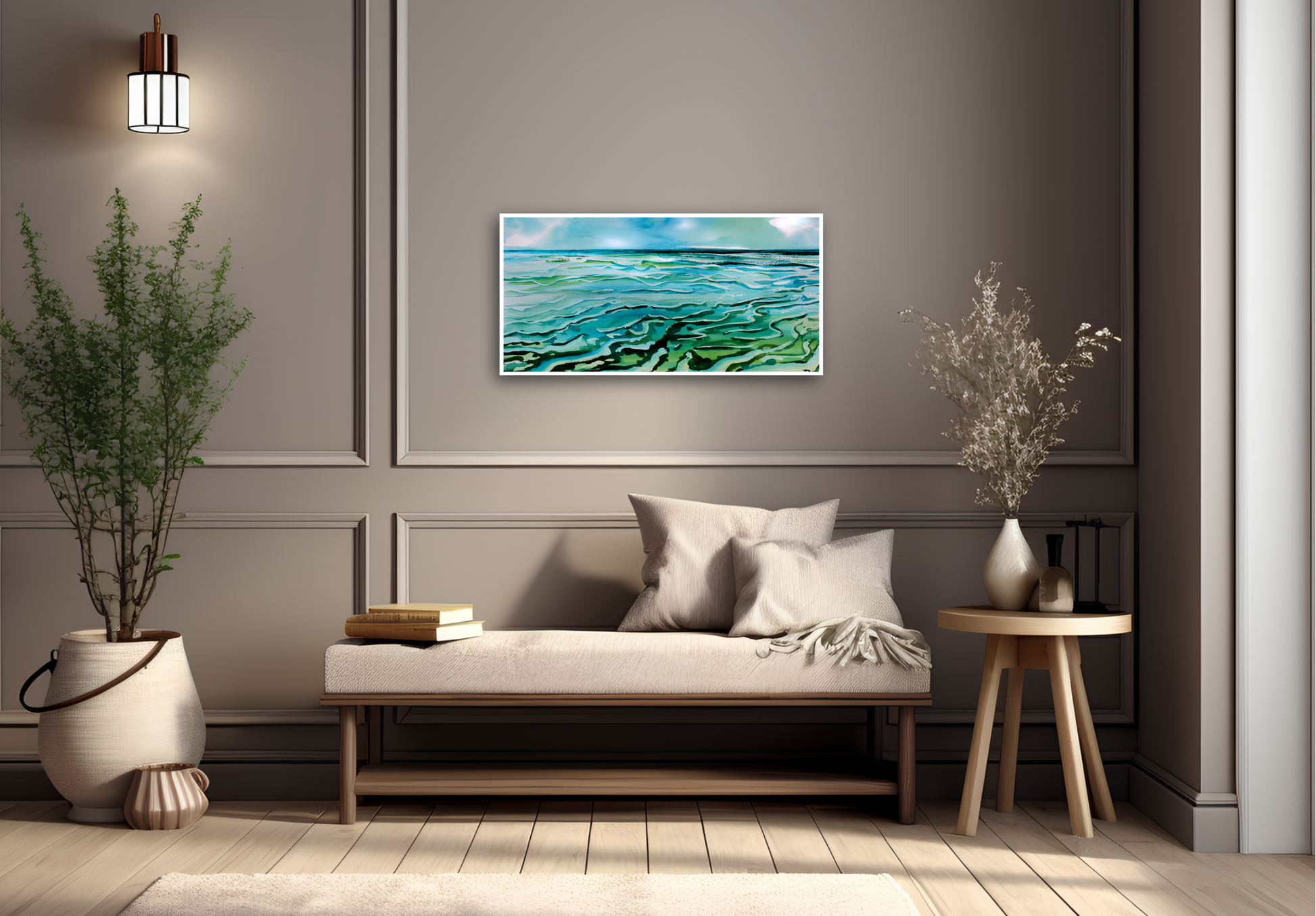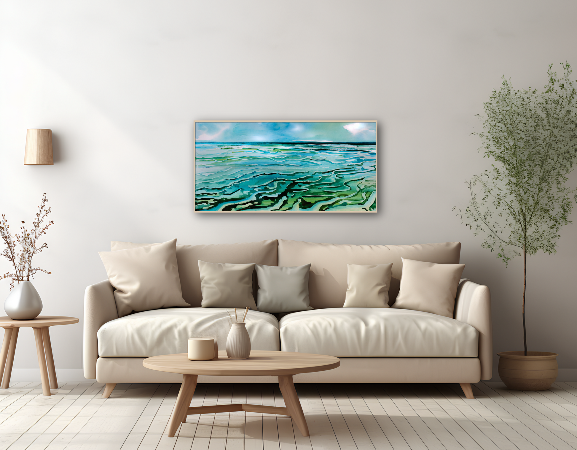 Dieses Aquarellbild fängt die Ebbe am Jadebusen ein – wenn das Meer sich nach der Flut wieder zurückzieht und im Wechsel von 12 Stunden immer neue Muster aus filigranen Rinnen, sandigen Erhebungen und spiegelnden Wasserflächen entstehen. Die geschwungenen Linien und changierenden Grün- und Blautöne ziehen den Blick in die Tiefe und machen das ewige Wechselspiel von Wasser, Licht und Zeit spürbar. Der hochwertige Kunstdruck wird mit brillanter Pigmenttinte auf echte Leinwand übertragen, wodurch selbst feine Nuancen und Strukturen erhalten bleiben. Gerahmt in einem handgefertigten Schattenfugenrahmen aus deutschem Holz – regional gefertigt und nachhaltig produziert. Ein exklusives Kunstwerk für qualitätsbewusste Kunden, die maritime Ruhe und die Magie der Gezeiten in ihr Zuhause holen möchten. 100 % Made in Germany.