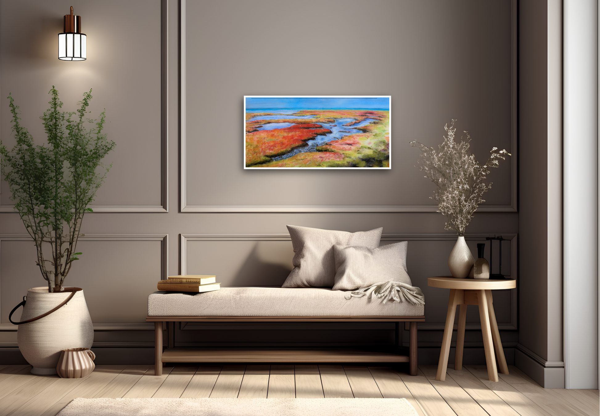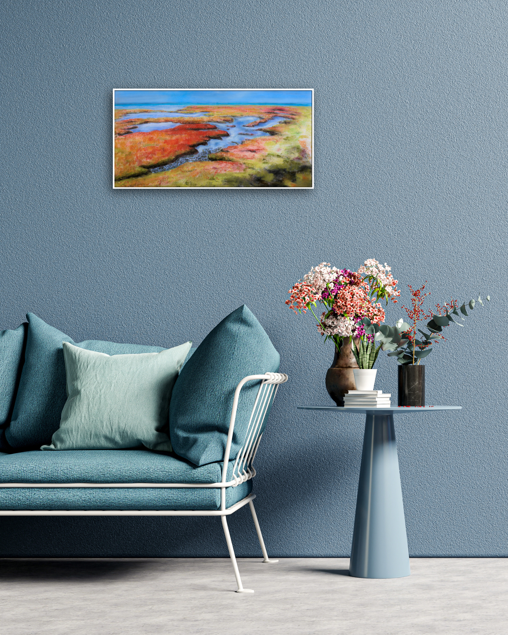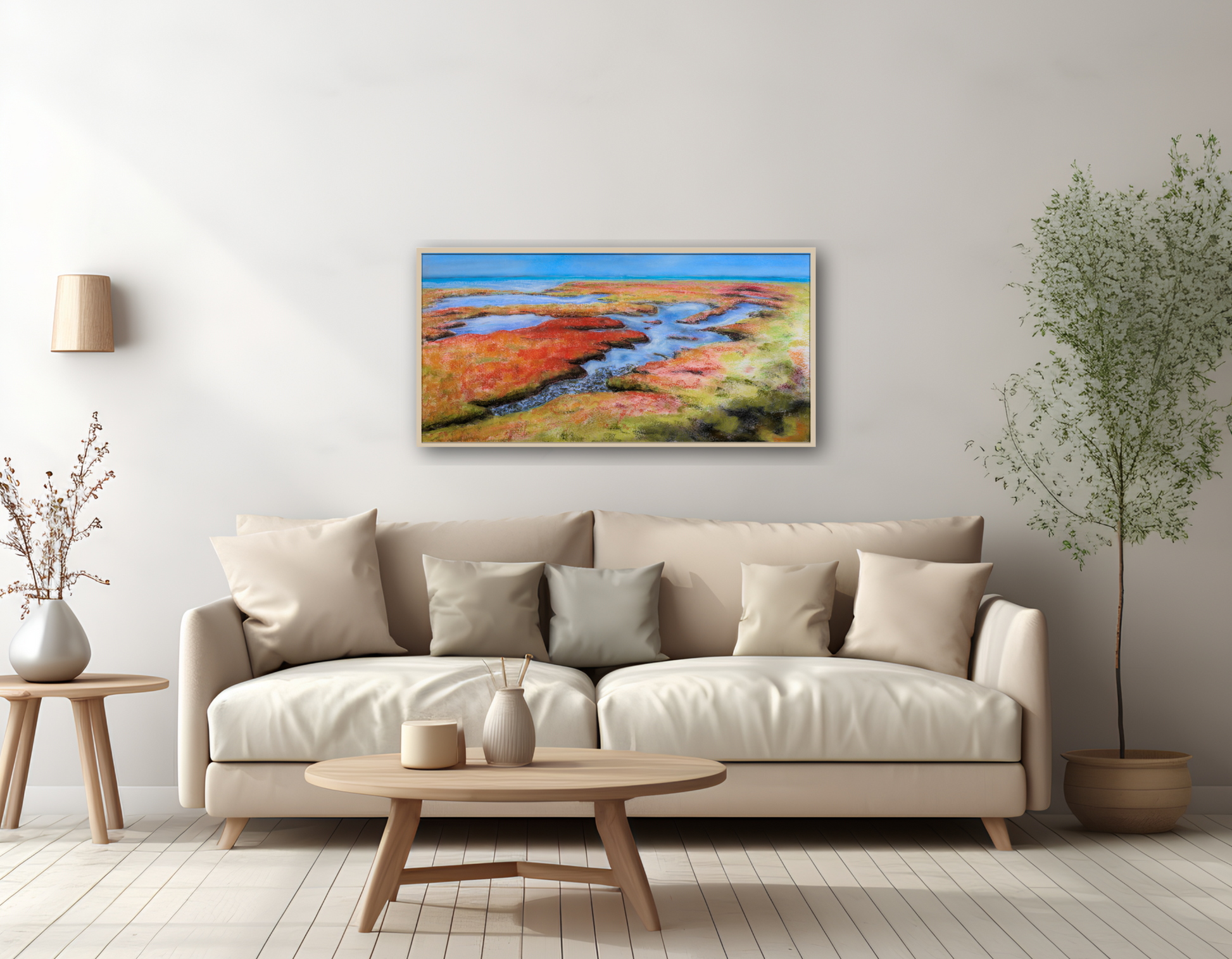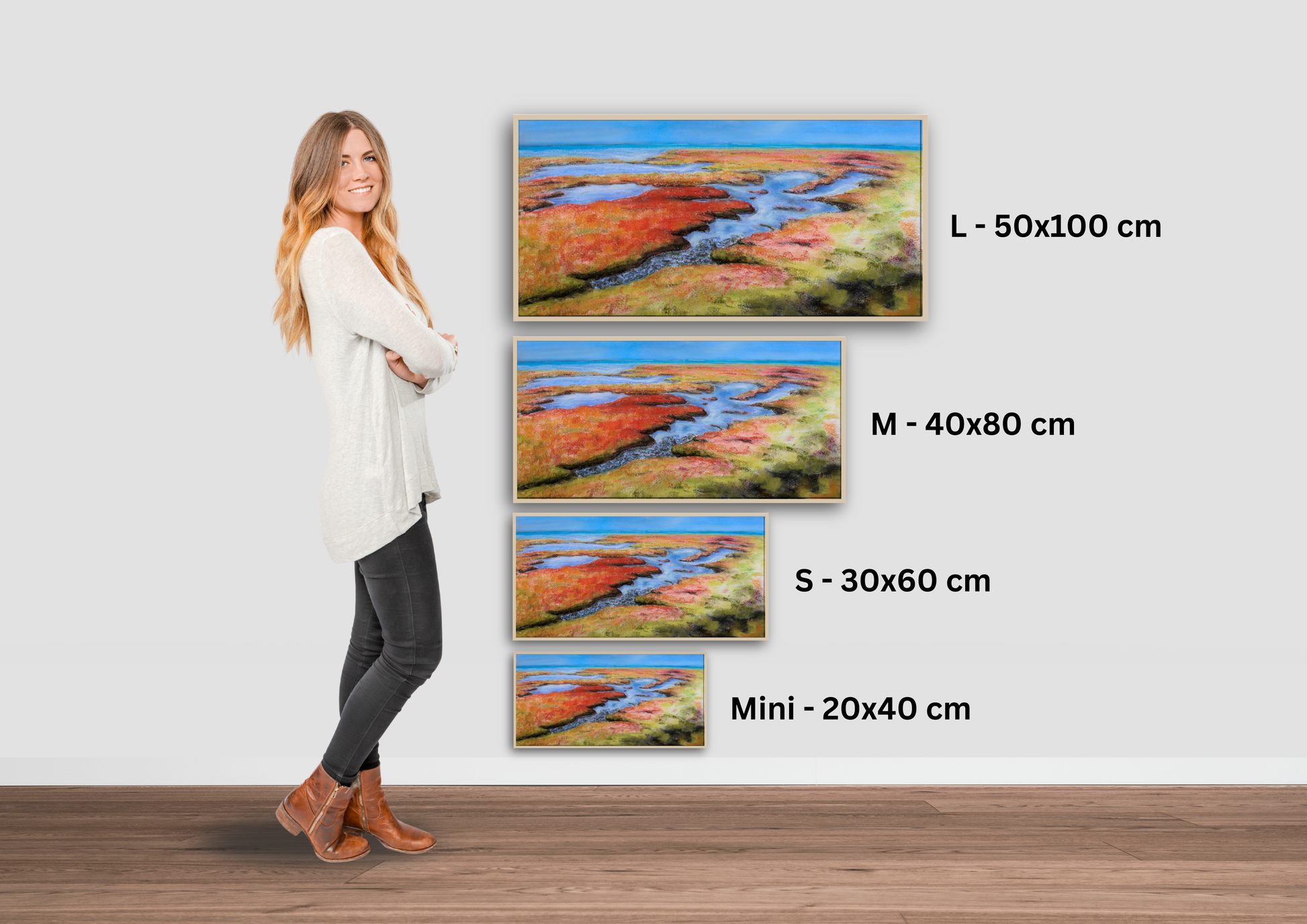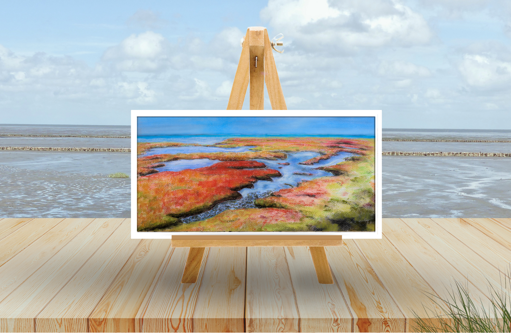 Dieses Pastellbild zeigt die stille Schönheit der friesischen Salzwiesen, dort, wo Land und Meer ineinander übergehen. Sanfte Grüntöne, rötlicher Strandflieder, bläuliche Nuancen im Wasser und das weite Himmelslicht fangen den besonderen Zauber dieser einzigartigen Landschaft ein. Der hochwertige Kunstdruck wird in hoher Auflösung mit leuchtender Pigmenttinte auf echte Leinwand übertragen. Durch die feine Textur und präzise Farbwiedergabe bleibt der Charakter des Originals vollständig erhalten. Gerahmt von einem handgefertigten Schattenfugenrahmen aus deutschem Holz, begeistert dieses einzigartige Kunstwert qualitätsbewusste Kunden, die ihr Zuhause mit klarer, zeitlose Präsenz und maritimer Ruhe bereichern möchten. Regional gefertigt, nachhaltig produziert, 100 % Made in Germany.